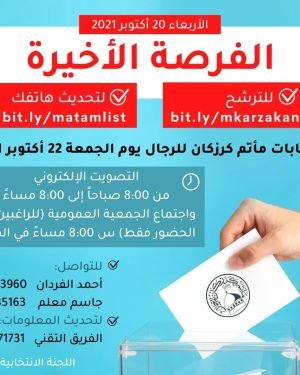 ‘ ۩ ﻣأﭠم ﻛرزﻛٱن .. 🗳 انتخابات مأتم كرزكان للرجال نداء الفرصة الأخيرة 📣 اليوم الأربعاء 20 أكتوبر 2021 🔴 آخر يوم للترشح: bit.ly/mkarzakan 🔴 ولتحديث هاتفك: bit.ly/matamlist والانتخابات يوم الجمعة 22 أكتوبر 2021 التصويت الإلكتروني: من 8:00 صباحاً إلى 8:00 مساءً، واجتماع الجمعية العمومية (للراغبين) س 8:00 مساءً في …
