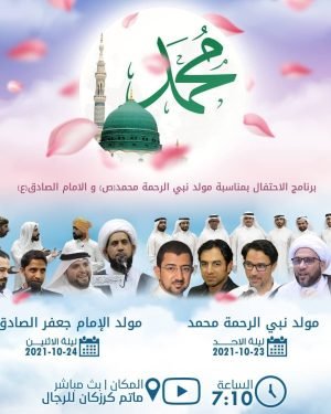 ‘ برنامج الاحتفال بمناسبة مولد نبي الرحمة محمد صلى الله عليه وآله وسلم وحفيده والإمام الصادق عليه السلام. المصدر