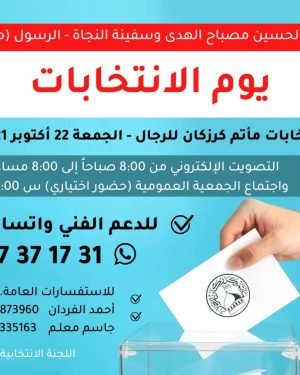 ‘ ۩ مأتم كرزكان .. إن الحسين مصباح الهدى وسفينة النجاة – الرسول (ص) 🗳️ يوم الانتخابات 🗓️ انتخابات مأتم كرزكان للرجال – الجمعة 22 أكتوبر 2021 التصويت الإلكتروني من 8:00 صباحاً إلى 8:00 مساءً واجتماع الجمعية العمومية (حضور اختياري) س 8:00م 🟢 للدعم الفني واتساب 37371731 للاستفسارات العامة أحمد …