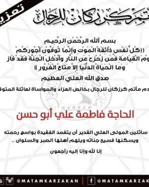 ‘ بسم ٱلله الرَّحْمٰنِ الرَّحِيـمِ {كُلُّ نَفْسٍ ذَآئِقَةُ الْمَوْتِ وَإِنَّمَا تُوَفَّوْنَ أُجُورَكُمْ يَوْمَ الْقِيَامَةِ فَمَن زُحْزِحَ عَنِ النَّارِ وَأُدْخِلَ الْجَنَّةَ فَقَدْ فَازَ وَما الْحَيَاةُ الدُّنْيَا إِلاَّ مَتَاعُ الْغُرُورِ } صدق الله العلي العظيم يتقدم مأتم كرزكان للرجال بخالص العزاء والمواساة لعائلة المرحومة “الحاجة فاطمة علي أبو حسن ” سائلين المولى العلي القدير أن …