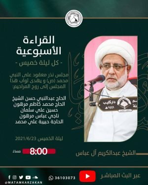 ‘ ۩ مأتم كرزكان .. « القرآءة الأسبوعية» *الخطيب* : الشيخ عبدالكريم آل عباس *الوقـــت* : 8:00 م *اللــــيلة* : ليلة الخميس *الموافق : 23/06/2021 * مجلس معقود على النبي محمد ( ص) ويهدى ثواب هذا المجلس إلى روح المراحيم : * الحاج عبدالنبي حسن الشيخ *الحاج محمد كاظم مرهون …