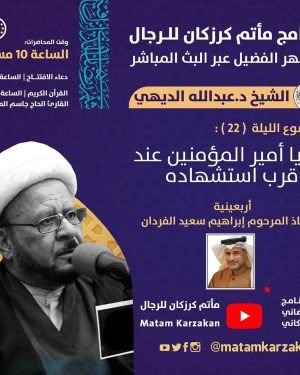 هذا الليلة “أربعينية” المرحوم الاستاذ إبراهيم سعيد الفردان . . رحم الله أهدى لروحه ثواب سورة الفاتحة . . ﻣأﭠم ﻛرزﻛٱن .. البرنامج الرمضاني الكرزكاني 🌙 برنامج مأتم كرزكان للرجال للشهر الفضيل عبر البث المباشر . . . *الليلة (22) : ليلة السبت 15/05/2020* . . *الدكتور الشيخ عبدالله الديهي* …