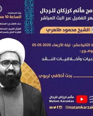 . ‘ ۩ ﻣأﭠم ﻛرزﻛٱن .. . . البرنامج الرمضاني الكرزكاني . 🌙 برنامج مأتم كرزكان للرجال للشهر الفضيل عبر البث المباشر . الليلة الثانية عشر : ليلة الأربعاء 05/05/2020 . الشيخ محمود طاهري . عنوان المحاضرة : *أدبيات وأخلاقيات النقد “* بحث أخلاقي وتربوي . دعاء الإفتتاح | الساعة …
