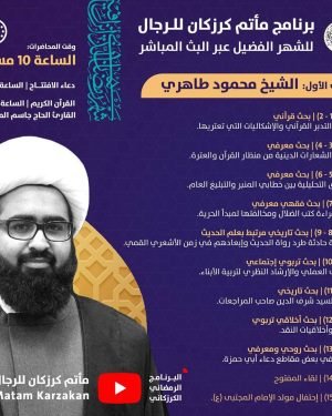 . ‘ ۩ ﻣأﭠم ﻛرزﻛٱن .. . . البرنامج الرمضاني الكرزكاني . 🌙 برنامج مأتم كرزكان للرجال للشهر الفضيل عبر البث المباشر . الليلة الثالثة عشر : ليلة الخميس 06/05/2020 . الشيخ محمود طاهري . عنوان المحاضرة : *تأملات في بعض مقاطع دعاء أبي حمزة “* بحث روحي معرفي . …