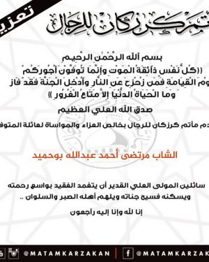 – . . بسم ٱلله الرَّحْمٰنِ الرَّحِيـمِ {كُلُّ نَفْسٍ ذَآئِقَةُ الْمَوْتِ وَإِنَّمَا تُوَفَّوْنَ أُجُورَكُمْ يَوْمَ الْقِيَامَةِ فَمَن زُحْزِحَ عَنِ النَّارِ وَأُدْخِلَ الْجَنَّةَ فَقَدْ فَازَ وَما الْحَيَاةُ الدُّنْيَا إِلاَّ مَتَاعُ الْغُرُورِ } صدق الله العلي العظيم . . تتقدم إدارة مأتم كرزكان للرجال بخالص العزاء والمواساة لعائلة المرحوم . . “الشاب مرتضى أحمد عبدالله …