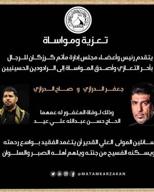 ‘ ۩ مأتم كرزكان .. . تعزية و مواساة . يتقدم رئيس و أعضاء مجلس إدارة مأتم كرزكان للرجال بأحر التعازي و أصدق المواساة الى الرادودين الحسينيين (جعفر الدرازي) و (صالح الدرازي) وذلك لوفاة المغفوز له عمهما الحاج حسن عبدالله علي عيد.. سائلين المولى العلي القدير أن يتغمد الفقيد بواسع …