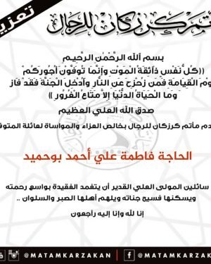– . . بسم ٱلله الرَّحْمٰنِ الرَّحِيـمِ {كُلُّ نَفْسٍ ذَآئِقَةُ الْمَوْتِ وَإِنَّمَا تُوَفَّوْنَ أُجُورَكُمْ يَوْمَ الْقِيَامَةِ فَمَن زُحْزِحَ عَنِ النَّارِ وَأُدْخِلَ الْجَنَّةَ فَقَدْ فَازَ وَما الْحَيَاةُ الدُّنْيَا إِلاَّ مَتَاعُ الْغُرُورِ } صدق الله العلي العظيم . . تتقدم إدارة مأتم كرزكان للرجال بخالص العزاء والمواساة لعائلة المرحومة . . “الحاجة فاطمة علي أحمد …