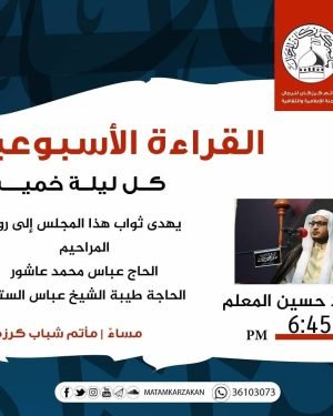 – . . ۩ مأتم كرزكان .. . . « القرآءة الأسبوعية» . . *الخطيب* : الملا حسين المعلم *الوقـــت* : 6:45 م . *المكـــان* : مأتم شباب كرزكان *اللــــيلة* : ليلة الخميس *الموافق* : 11/12/2019 . . يهدى ثواب هذا المجلس إلى أرواح المراحيم : . . الحاج عباس …
