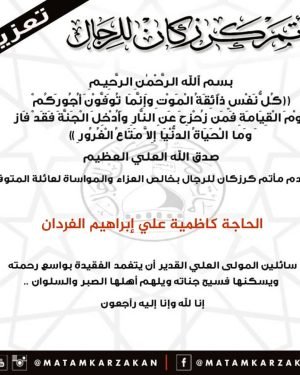 – . . بسم ٱلله الرَّحْمٰنِ الرَّحِيـمِ {كُلُّ نَفْسٍ ذَآئِقَةُ الْمَوْتِ وَإِنَّمَا تُوَفَّوْنَ أُجُورَكُمْ يَوْمَ الْقِيَامَةِ فَمَن زُحْزِحَ عَنِ النَّارِ وَأُدْخِلَ الْجَنَّةَ فَقَدْ فَازَ وَما الْحَيَاةُ الدُّنْيَا إِلاَّ مَتَاعُ الْغُرُورِ } صدق الله العلي العظيم . . تتقدم إدارة مأتم كرزكان للرجال بخالص العزاء والمواساة لعائلة المرحومة . . “الحاجة كاظمية علي إبراهيم …