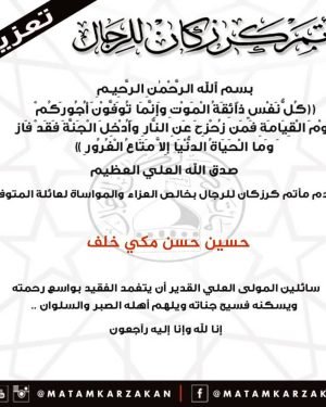 – . . بسم ٱلله الرَّحْمٰنِ الرَّحِيـمِ {كُلُّ نَفْسٍ ذَآئِقَةُ الْمَوْتِ وَإِنَّمَا تُوَفَّوْنَ أُجُورَكُمْ يَوْمَ الْقِيَامَةِ فَمَن زُحْزِحَ عَنِ النَّارِ وَأُدْخِلَ الْجَنَّةَ فَقَدْ فَازَ وَما الْحَيَاةُ الدُّنْيَا إِلاَّ مَتَاعُ الْغُرُورِ } صدق الله العلي العظيم . . تتقدم إدارة مأتم كرزكان للرجال بخالص العزاء والمواساة لعائلة المرحوم . . “حسين حسن مكي خلف” …