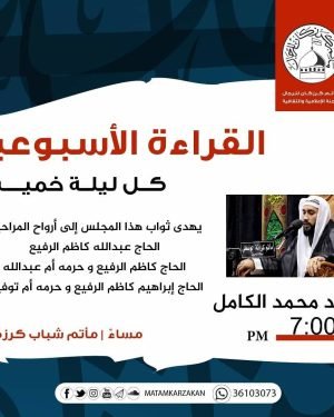 – . . ۩ مأتم كرزكان .. . . « القرآءة الأسبوعية» . . *الخطيب* : السيد محمد الكامل *الوقـــت* : 7:00 م . *المكـــان* : مأتم شباب كرزكان *اللــــيلة* : ليلة الخميس *الموافق* : 27/11/2019 . . يهدى ثواب هذا المجلس إلى أرواح المراحيم : . . الحاج عبدالله …