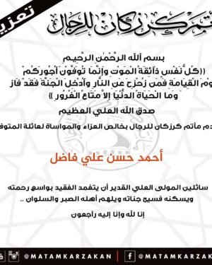 – . . بسم ٱلله الرَّحْمٰنِ الرَّحِيـمِ {كُلُّ نَفْسٍ ذَآئِقَةُ الْمَوْتِ وَإِنَّمَا تُوَفَّوْنَ أُجُورَكُمْ يَوْمَ الْقِيَامَةِ فَمَن زُحْزِحَ عَنِ النَّارِ وَأُدْخِلَ الْجَنَّةَ فَقَدْ فَازَ وَما الْحَيَاةُ الدُّنْيَا إِلاَّ مَتَاعُ الْغُرُورِ } صدق الله العلي العظيم . . تتقدم إدارة مأتم كرزكان للرجال بخالص العزاء والمواساة لعائلة المرحوم . . “أحمد حسن علي فاضل” …