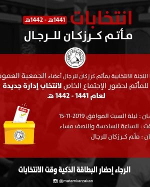 – . . ۩ ﻣأﭠم ﻛرزﻛٱن .. . . . إنتخابات (1441 هـ – 1442 هـ) مأتم كرزكان للرجال . . تدعوا اللجنة الانتخابية بمأتم كرزكان للرجال أعضاء الجمعية العمومية للمأتم لحضور الاجتماع الخاص لإنتخاب إدارة جديدة لعام 1441 هـ – 1442 هـ . . الزمان – ليلة السبت الموافق …