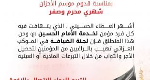 – . . . ۩ ﻣأﭠم ﻛرزﻛٱن .. *لجنة الضيافة* الموكب العزائي – كرزكان بمناسبة قدوم موسم الأحزان شهري محرم و صفر أشهر العطاء الحسيني ، الذي يتهافت فيه كل فرد مؤمن لخدمة الإمام الحسين (ع) و من هذا المنطلق فإن لجنة الضيافة في الموكب العزائي تهيب بالراغبين من المؤمنين …