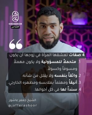 4 صفات تعشقها المرأة في زوجها أن يكون: متحملاً للمسؤولية ولا يكون مهملاً ومسوفاً وكسولاً. واثقاً بنفسه ولا يقلل من شأنه. أنيقاً ومهتماً بملابسه ومظهره الخارجي. سنداً لها في كل أحوالها. سماحة الشيخ جعفر عاشور . @jafferashoor . المصدر: إنستغرام