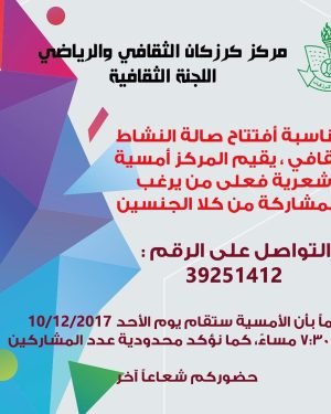أكمل القراءة »تعلن اللجنة الثقافية بالمركز، عن إقامة أمسية شعرية مفتوحة وذلك يوم الاحد ١٠-١٢-٢…