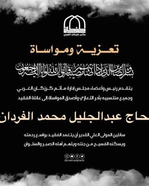 تتقدم إدارة مأتم كرزكان الغربي وجميع منتسبيه بخالص العزاء والمواساة لعائلة الفقيد المتوفى الحاج عبدالجليل محمد الفردان . سائلين المولى القدير ان يتغمد الفقيد بواسع رحمته وان يسكنه فسيح جنته .. إنا لله وإنا إليه لراجعون . . #Bahrain #Karzakan #Matmalgharbi #مأتم_كرزكان_الغربي #كرزكان #البحرين #محرم #محرم_١٤٤٣ #عز_دين_وإمام #عاشوراء_البحرين المصدر