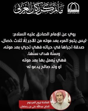 روي عن الإمام الصادق عليه السلام : “ليس يتبع المرء بعد موته من الأجر إلّا ثلاث خصال، صدقة أجراها في حياته فهي تجري بعد موته، وسنَّة هدى سنَّها، فهي يُعمل بها بعد موته أو ولد صالح يدعو له” 🚩 الفاتحة لروح المرحوم الحاج عبدالله علي بن رمضان وجميع المؤمنين والمؤمنات …