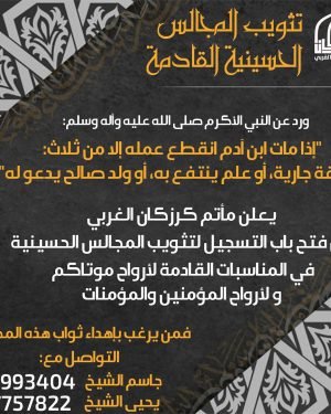 قال أبو عبد الله (عليه السلام):”من عمل من المؤمنين عن ميت عملا أضعف الله له أجره وينعم به الميت” . يعلن مأتم كرزكان الغربي عن فتح باب التسجيل لتثويب المجالس الحسينية في المناسبات القادمة فعلى من يرغب بالمشاركة في هذه المجالس وإهدائها لأرواح ذويهم المبادرة بالتسجيل: . 📍جاسم الشيخ: 39993404 …