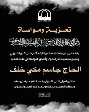 شكر على تعازِ تتقدم عائلة الخلف بجزيل الشكر وعظيم الامتنان لكل من شاركنا في مصابنا الجلل بفقيدنا الغالي المرحوم الحاج جاسم مكي خلف سواء من قدّم لنا واجب العزاء بالحضور الشخصي أو من خلال الاتصال الهاتفي أو الرسائل، أو من شاركنا العزاء عبر صفحات المواقع الالكترونية ووسائل التواصل الاجتماعي، والذي …