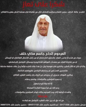 شكر على تعازِ تتقدم عائلة الخلف بجزيل الشكر وعظيم الامتنان لكل من شاركنا في مص…