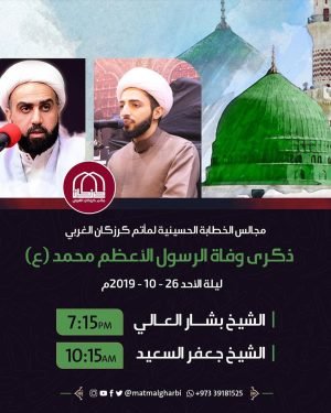 أكمل القراءة »برنامج الخطابة لمأتم كرزكان الغربي في ذكرى وفاة النبي الاكرم محمد(ع) . . ليلة …