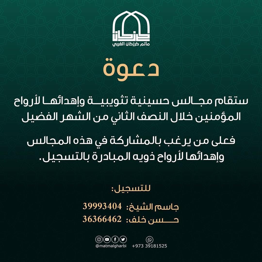 قال أبو عبد الله (عليه السلام):”من عمل من المؤمنين عن ميت عملا أضعف الله له أجره وينعم به الميت” . ستقام مجالس حسينية تثويبية وإهدائها لأرواح المؤمنين خلال النصف الثاني من الشهر الفضيل ، فعلى من يرغب بالمشاركة في هذه المجالس وإهدائها لأرواح ذويهم المبادرة بالتسجيل: . 📍جاسم الشيخ: 39993404 …