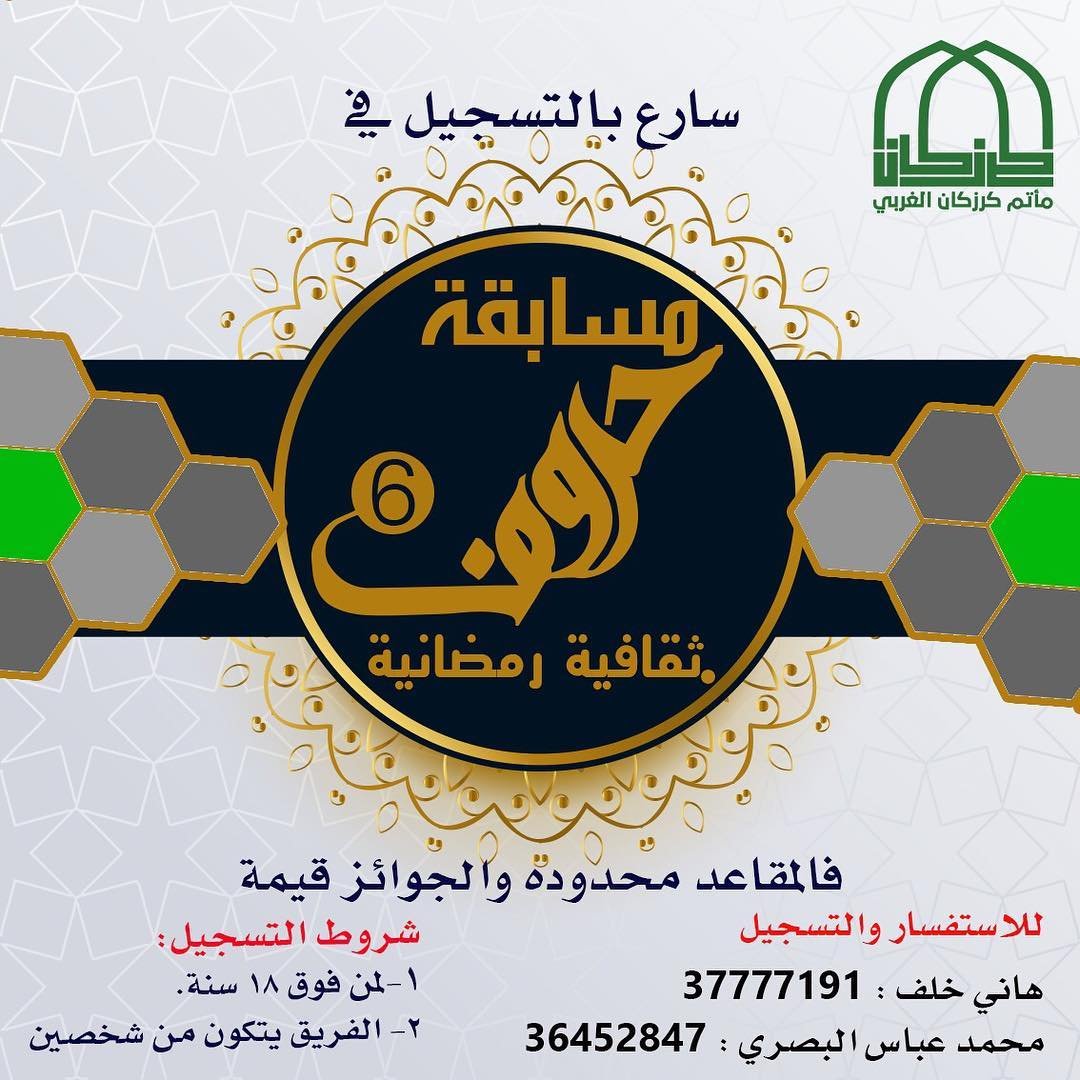 مسابقة حروف الثقافية الرمضانية تعود لكم للسنة السادسة في مأتم كرزكان الغربي . . مسابقة حروف وسرعة البديهة سجل فريقك المكون من لاعبين فوق ١٨ سنة ونافس للفوز بجوائز قيمة . . للاستفسار والتسجيل: هاني خلف: 37777191 محمد عباس البصري: 36452847 . المقاعد محدودة~ . #Bahrain #Karzakan #Matmalgharbi #مأتم_كرزكان_الغربي #كرزكان #البحرين #رمضان …