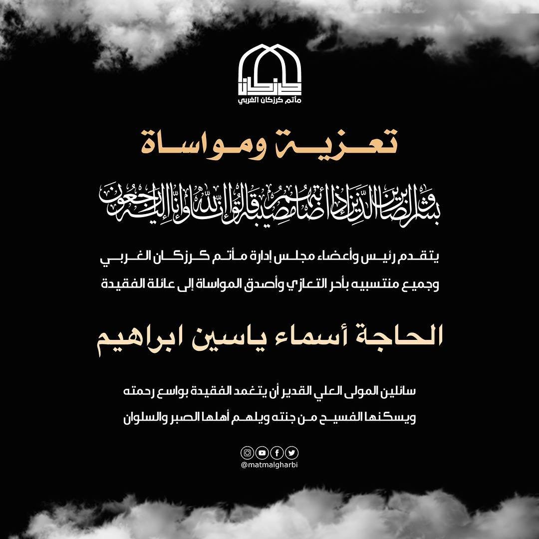 تتقدم إدارة مأتم كرزكان الغربي وجميع منتسبيه بخالص العزاء والمواساة لعائلة الفقيدة المتوفاة الحاجة أسماء ياسين ابراهيم سائلين المولى القدير ان يتغمد الفقيدة بواسع رحمته وان يسكنها فسيح جنته .. إنا لله وإنا إليه لراجعون . . #Bahrain #Karzakan #Matmalgharbi #مأتم_كرزكان_الغربي #كرزكان #البحرين المصدر