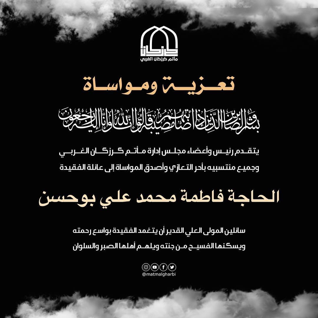 تتقدم إدارة مأتم كرزكان الغربي وجميع منتسبيه بخالص العزاء والمواساة لعائلة الفقيدة المتوفاة الحاجة فاطمة محمد علي بوحسن سائلين المولى القدير ان يتغمد الفقيدة بواسع رحمته وان يسكنها فسيح جنته .. إنا لله وإنا إليه لراجعون . . #Bahrain #Karzakan #Matmalgharbi #مأتم_كرزكان_الغربي #كرزكان #البحرين المصدر