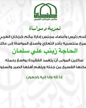 تتقدم إدارة مأتم كرزكان الغربي وجميع منتسبيه بخالص العزاء والمواساة لعائلة الفقيدة المتوفاة الحاجة زينب علي سلمان سائلين المولى القدير ان يتغمد الفقيدة بواسع رحمته وان يسكنها فسيح جنته .. إنا لله وإنا إليه لراجعون . . #Bahrain #Karzakan #Matmalgharbi #مأتم_كرزكان_الغربي #كرزكان #البحرين المصدر
