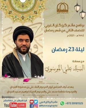 مجلس ليلة ٢٣ رمضان . 🎙مع سماحة السيد علي الموسوي . . 🎥 يمكنكم متابعة المجلس في قناة المأتم في اليوتيوب بالضغط على اللنك الموجود في بروفايل المأتم 🎥 . 📍 يهدى ثواب المجلس لروح المرحوم الملا علي بن محفوظ الفردان والمرحومة فاطمة محمد علي والمرحوم الاستاذ ابراهيم سعيد الفردان …