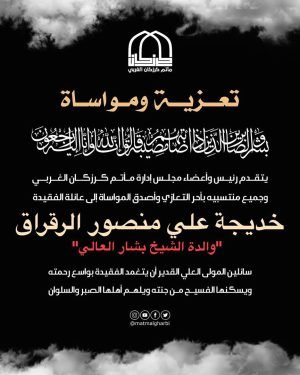 تتقدم إدارة مأتم كرزكان الغربي وجميع منتسبيه بخالص العزاء والمواساة لعائلة الفقيدة المتوفاة خديجة علي منصور الرقراق – “والدة الشيخ بشار العالي” . سائلين المولى القدير ان يتغمد الفقيدة بواسع رحمته وان يسكنها فسيح جنته .. إنا لله وإنا إليه لراجعون . . #Bahrain #Karzakan #Matmalgharbi #مأتم_كرزكان_الغربي #كرزكان #البحرين المصدر
