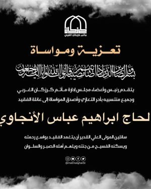 تتقدم إدارة مأتم كرزكان الغربي وجميع منتسبيه بخالص العزاء والمواساة لعائلة الفقيد المتوفى الحاج ابراهيم عباس الأنجاوي . سائلين المولى القدير ان يتغمد الفقيد بواسع رحمته وان يسكنه فسيح جنته .. إنا لله وإنا إليه لراجعون . . #Bahrain #Karzakan #Matmalgharbi #مأتم_كرزكان_الغربي #كرزكان #البحرين المصدر
