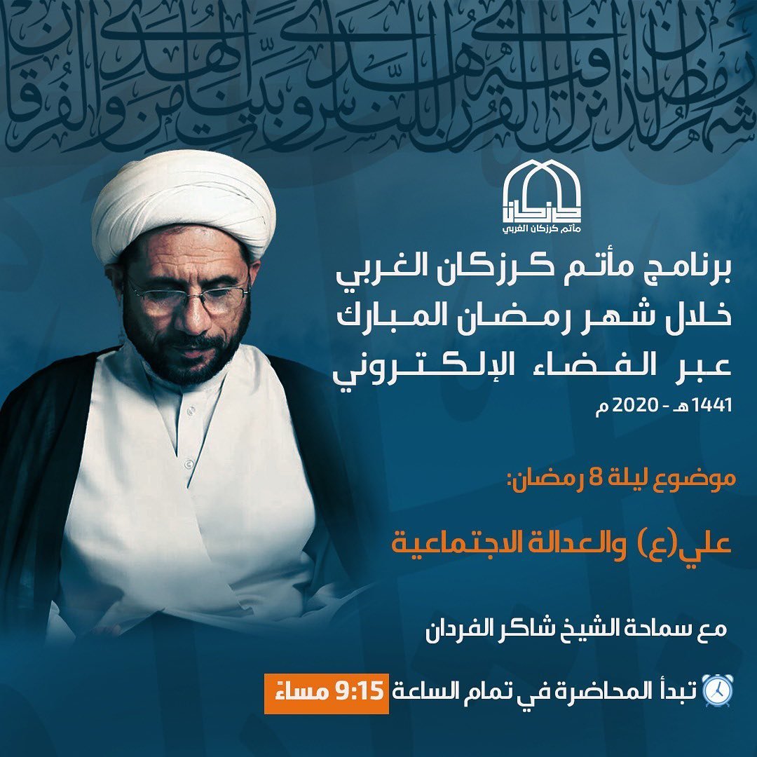 محاضرة ليلة ٨ رمضان بعنوان: 🔺 علي(ع) والعدالة الاجتماعية 🔺 . . ⏱الوقت : ٩:١٥ مساءً . 🎥 سيكون البث على الانستغرام. يمكنكم الاشتراك بالقناة بالضغط على اللنك الموجود في بروفايل المأتم لتصلكم التنبيهات . . #Bahrain #Karzakan #Matmalgharbi #مأتم_كرزكان_الغربي #كرزكان #البحرين #رمضان #كرزكانكم #الشيخ_شاكر_الفردان المصدر