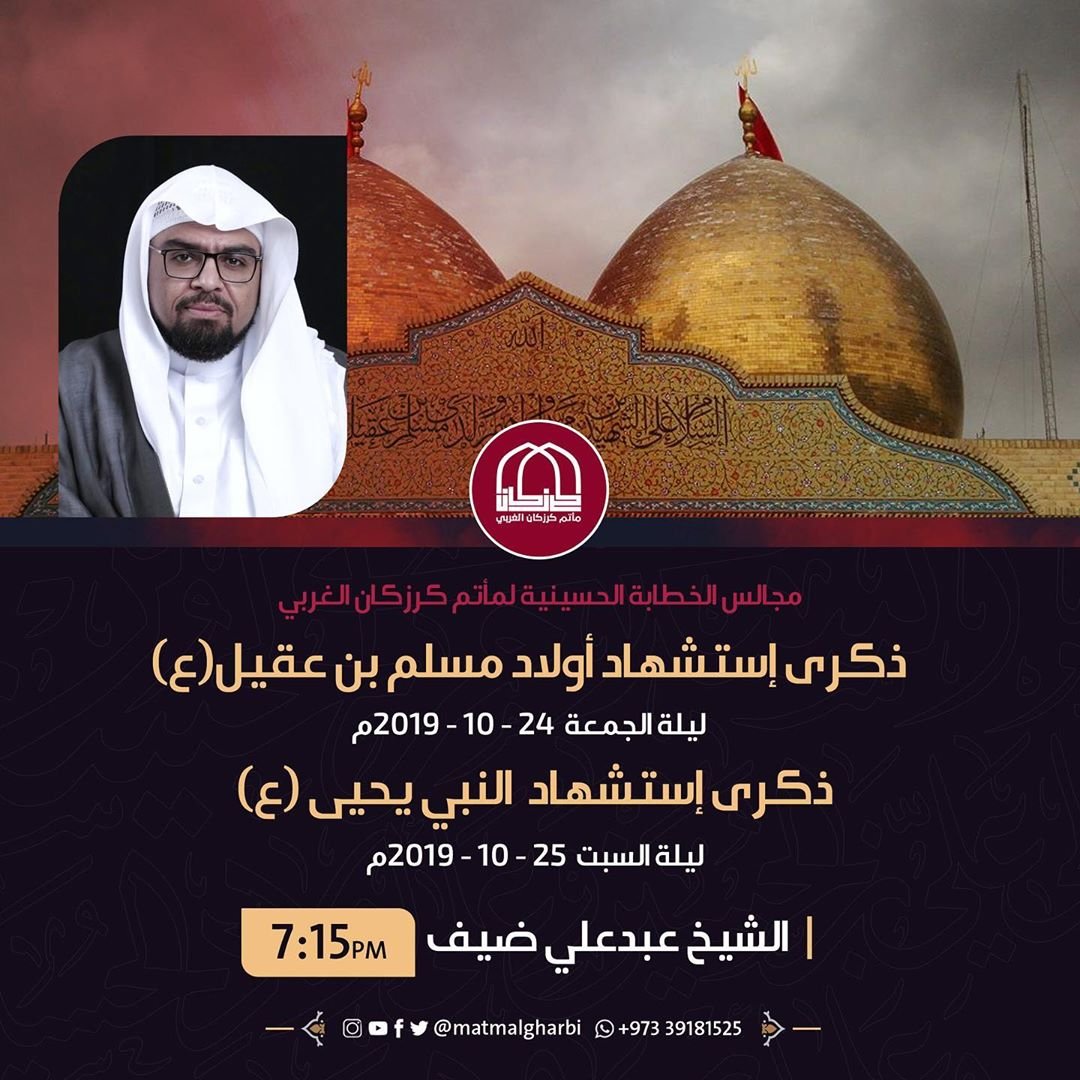 برنامج الخطابة لمأتم كرزكان الغربي في المناسبات القادمة لشهر صفر ١٤٤١ هـ . . ♦️ ذكرى استشهاد أولاد مسلم بن عقيل(ع) ليلة الجمعة ٢٤/١٠/٢٠١٩ بمشاركة الخطيب الشيخ عبدعلي ضيف