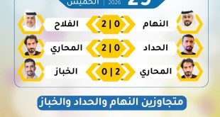 وأسفرت نتائج مباريات يوم الخميس 29 يناير 2026 عن فوز فريق الفلاح على فريق النهام بنتيجة (2 – 0)، كما تمكن فريق المحاري من تحقيق انتصار مستحق على فريق الحداد بنفس النتيجة (2 – 0). وفي المباراة الثالثة، نجح فريق المحاري في تحقيق فوز آخر على فريق الخباز بنتيجة (2 …