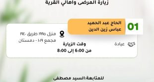 16_01_2026 1️⃣ الحاج عبد الحميد عباس زين الدين العنوان منزل ١٩٩٥ طريق ١٩٤٠ مجمع ١٠١٩ دمستان الموقع https://maps.app.goo.gl/QHqqj6CUNtbY2XS27 *اللهم إشف كل مريض* ♦️ *وقت الزيارة من الساعة* 6:00 إلى 8:00 مساءً ♦️لمتابعة أخبار *جمعية كرزكان الخيرية* 🔺Instagram: @karzakancharity 🔺 Facebook: جمعية كرزكان الخيرية صفحة الدفع الألكتروني 🔺 https://kzncharity.com/e للمتابعة: السيد …