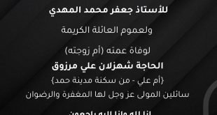 للأستاذ جعفر محمد المهدي وعموم العائلة الكريمة بوفاة عمته (أم زوجته) *الحاجة شهزلان علي مرزوق* {أم علي} من سكنة مدينة حمد يوم أمس الجمعة 5-12-2025 التشييع بمقبرة كرزكان صباح اليوم السبت الساعة 9:30 تجهيز القبر الساعة 7:00 تغمد الله الفقيدة بواسع رحمته وألهم أهلها وذويها الصبر والسلوان رحم الله من …
