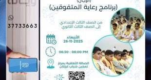 أولياء أمور الطلبة المتفوقين (الرجال فقط) لحضور اللقاء التعريفي التشاوري حول برنامج *رعاية المتفوقين* من الثالث إعدادي ولغاية الثالث ثانوي وذلك يوم الأربعاء / ليلة الخميس الساعة 6:30 مساءً بالصالة الثقافية لمركز تمكين شباب كرزكان يرجى التسجيل بمسح الرمز الموجود في صورة الإعلان مع تحيات/ لجنة دعم الطالب جمعية كرزكان …