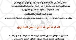 – . . بسم ٱلله الرَّحْمٰنِ الرَّحِيـمِ {كُلُّ نَفْسٍ ذَآئِقَةُ الْمَوْتِ وَإِنَّمَا تُوَفَّوْنَ أُجُورَكُمْ يَوْمَ الْقِيَامَةِ فَمَن زُحْزِحَ عَنِ النَّارِ وَأُدْخِلَ الْجَنَّةَ فَقَدْ فَازَ وَما الْحَيَاةُ الدُّنْيَا إِلاَّ مَتَاعُ الْغُرُورِ } صدق الله العلي العظيم . . . تتقدم إدارة مأتم كرزكان للرجال بخالص العزاء والمواساة لعائلة المرحومة . . “الحاجة أمينة علي …