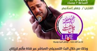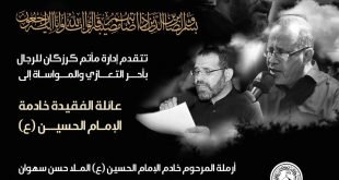 ‘ تعزية و مواساة . تتقدم إدارة مأتم كرزكان للرجال بأحر التعازي و المواساة إلى عائلة الفقيدة خادمة الإمام الحسين عليه السلام أرملة المرحوم خادم الإمام الحسين الملا حسن سهوان، والدة كل من.. . علي و أحمد و جعفر و حسين و مهدي و المرحوم محمد.. . سائلين المولى العلي …