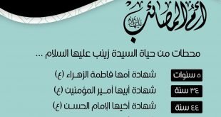 ‘ نتقدم بأحر التعازي الى مقام صاحب العصر و الزمان عجل الله له الفرج و المراجع العظام و المؤمنين و المؤمنات بمناسبة استشهاد أم المصائب زينب بنت علي عليهما السلام. خبرها في كربلاء : كان لها ( عليها السلام ) في واقعة كربلاء المكان البارز في جميع المواطن ، فهي …