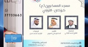 🔸 ذكرى مولد السيدةزينب عليها السلام 📅 ليلة الأربعاء 28 / 10 / 2025 ⏰ بعد صلاة العشاءين مباشرة فقرات الحفل ~ القرآن الكريم ~ الكلمة سماحة الشيخ أحمد الزاكي ~ الشعر الدكتور علي خميس ~ الجلوات الرادود محمد مدن 🔸يوجد مكان مخصص للنساء 🔸 للضيافة والاستفسار على الأرقام التالية …