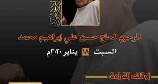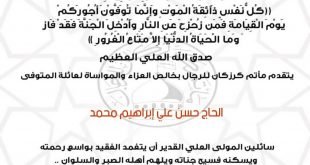 – . . بسم ٱلله الرَّحْمٰنِ الرَّحِيـمِ {كُلُّ نَفْسٍ ذَآئِقَةُ الْمَوْتِ وَإِنَّمَا تُوَفَّوْنَ أُجُورَكُمْ يَوْمَ الْقِيَامَةِ فَمَن زُحْزِحَ عَنِ النَّارِ وَأُدْخِلَ الْجَنَّةَ فَقَدْ فَازَ وَما الْحَيَاةُ الدُّنْيَا إِلاَّ مَتَاعُ الْغُرُورِ } صدق الله العلي العظيم . . تتقدم إدارة مأتم كرزكان للرجال بخالص العزاء والمواساة لعائلة المرحوم . . “الحاج حسن علي إبراهيم …