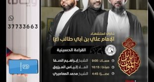 ┈╾۞ *ذكرىٰ استشھاد الإمام* ┈╾۞ *عـلي بن أبي طالب ’ع‘* ⌯ القراءة الحسينية ≣ الشيخ إبراهيم الصفا ≣ 09:00 مساءً ≣ الملا إلياس المرزوق ≣ 10:15 صباحًا ≣ الشيخ محمد المعاميري ≣ 04:45 عصرًا ❖ ملاحظات: • القراءة عصرًا في مأتم شباب كرزكان • يوجد نقل مباشر للنساء بمأتم كرزكان …