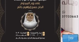 🔔 *ليلة الجمعة* 🗓️ *06-02-2025م* ⏰ *07:30 مساءً* 📍 *منزل المرحوم الحاج حسن إبراهيم خاتم* رحم الله من قرأ لروحه الفاتحة. المصدر: إنستغرام