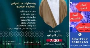 ⬅️ *مجلس المرحوم الحاج عبدالله الخاتم* وذلك في ليلة الجمعة الموافق ١٢ ديسمبر و ستكون القراءة ⏰ *الـسـاعة 6:45 مساءً* *بمـشاركة الـخـطـيب / ملا عقيل المرزوق.* بعد قراءة دعاء كميل. والله ولي التوفيق. المصدر: إنستغرام
