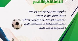 غداً السبت الموعد الأخير للتسجيل،،، اللجنة الرياضية بالمركز تعلن عن بدء التسجيل لدورة كرزكان الرمضانية الثامنة لكرة القدم. ◽آخر موعد للتسجيل السبت ١٩ مارس ٢٠٢٢. ◽كشف اللاعبين مكون من ١٥ لاعب. ◽يسمح بتسجيل ٣ لاعبين محترفين من خارج القرية. ◽يعتمد التسجيل فقط عند تسليم قائمة الفريق. ◽تحديد إداري غير لاعب …