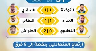 أكمل القراءة »أسفرت نتائج مباريات اليوم السبت 31 يناير 2026 عن تعادل فريق السقاي مع فريق النوخذة بنتيجة (1 – 1)، فيما انتهت مواجهة النهام والحداد بالتعادل الإيجابي ذاته (1 – 1). وفي المباراة الثالثة، تمكن فريق الطو